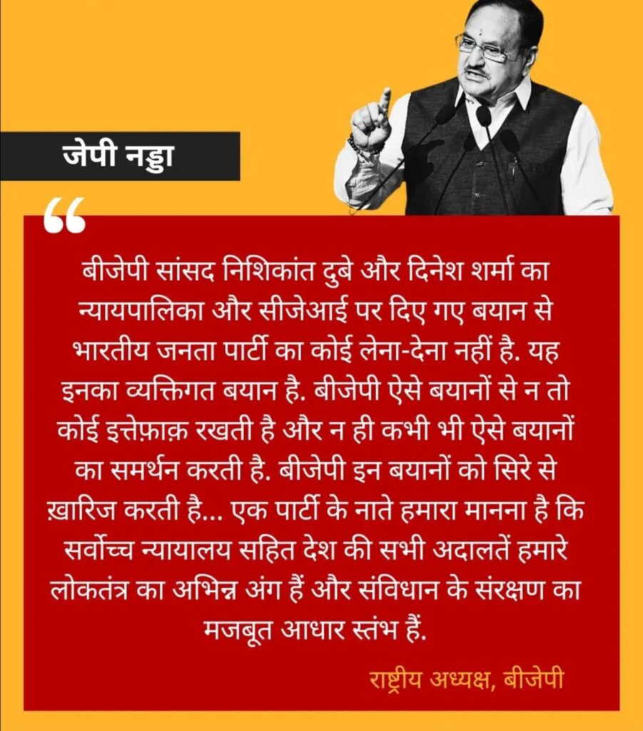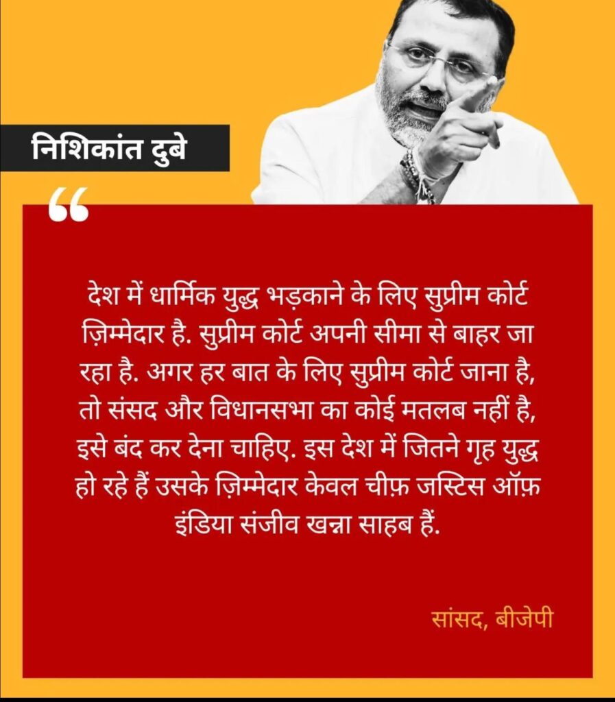 CHIEF JUSTICE OF INDIA संजीव खन्ना गृहयुद्ध के लिए जिम्मेदार.. बीजेपी सांसद निशिकांत दुबे ने दिया BLACK STATEMENT, अब खुद बुरी तरह फंसे Leave a Comment / POLITICS / By vishnuthejournalist@gmail.com Spread the love BIG OPINION BY EDITOR VISHNU AGARWAL/आपकी आवाज/DAILY INDIATIMES/22.04.25 Related Spread the love Related Posts काँग्रेस अधिवेशन में सचिन पायलट की जोरदार दहाड़, पार्टी में बढ़ रही है ताकत National Herald Case: ED की चार्जशीट में सोनिया गांधी और राहुल गांधी का नाम, नेशनल हेराल्ड केस में बड़ा अपडेट Pahalgam Terror Attack: आतंकियों ने धर्म पूछ-पूछकर मारी गोली, बिलखती पत्नी की बात सुन दहल जाएगा दिल Terrorist Attack in J&K.. हिन्दुओ का बेरहमी से नरसंहार, सवालों से भाग नहीं सकती मोदी सरकार – सुरक्षा में चूक एक बड़ा सवाल? मेरे बिना वहां मत जाना’, आखिर किसकी वजह से आजतक कश्मीर नहीं गए शाहरुख खान, खुद किया खुलासा JAIPUR RAJASTHAN: ‘मुसलमान भी देशभक्त हैं’ राजस्थान बीजेपी चीफ की अपने ही नेताओं को दो टूक, कटघरे में विधायक बाल मुकुंद आचार्य?