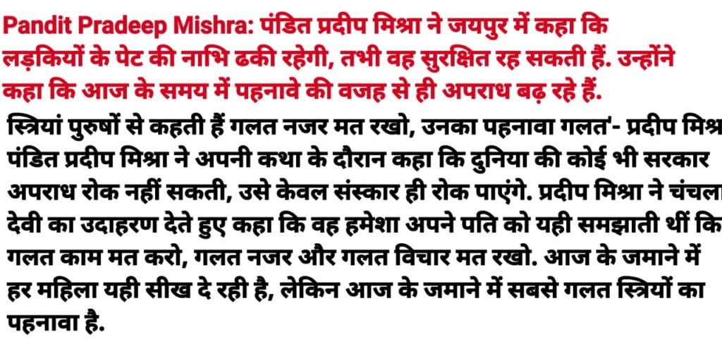 Pandit Pradeep Mishra: पंडित प्रदीप मिश्रा ने जयपुर में कहा कि लड़कियों के पेट की नाभि ढकी रहेगी, तभी वह सुरक्षित रह सकती हैं. उन्होंने कहा कि आज के समय में पहनावे की वजह से ही अपराध बढ़ रहे हैं.स्त्रियां पुरुषों से कहती हैं गलत नजर मत रखो, उनका पहनावा गलत’- प्रदीप मिश्रापंडित प्रदीप मिश्रा ने अपनी कथा के दौरान कहा कि दुनिया की कोई भी सरकार अपराध रोक नहीं सकती, उसे केवल संस्कार ही रोक पाएंगे. प्रदीप मिश्रा ने चंचला देवी का उदाहरण देते हुए कहा कि वह हमेशा अपने पति को यही समझाती थीं कि गलत काम मत करो, गलत नजर और गलत विचार मत रखो. आज के जमाने में हर महिला यही सीख दे रही है, लेकिन आज के जमाने में सबसे गलत स्त्रियों का पहनावा है.